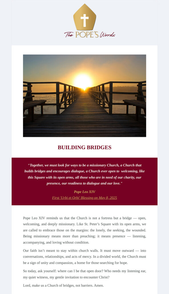 Subscribe to receive a daily email reflection inspired by the words and teachings of Pope Leo XIV. Each message is designed to offer spiritual insight, encouragement, and guidance for your daily walk of faith.
